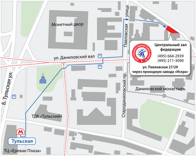 От станция метро «Тульская», последний вагон из центра. Выйдя из метро на улицу, развернитесь на 180° и идите в сторону Святоданиловского монастыря через трамвайные пути до улицы Павловская. По улице Павловская - первый дом из красного кирпича.