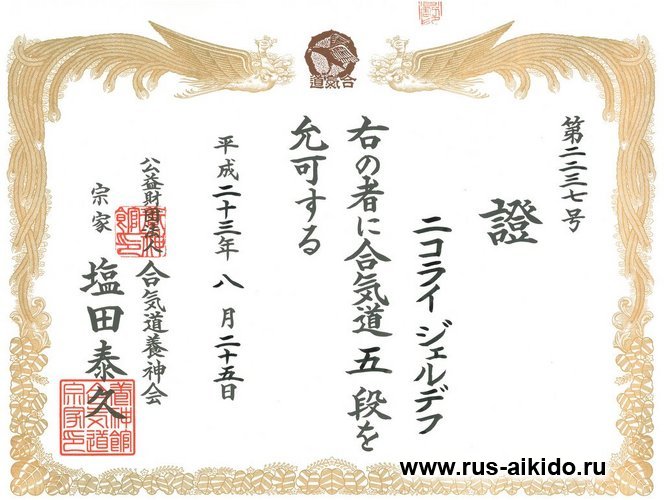 В том же году Shihan Тцунео Андо (8-й Дан Ёсинкан Айкидо) присваивает Жердеву Н.Н. инструкторскую степень, позволяющую принимать экзамены до первого Дана включительно и выдавать сертификаты Хонбу Додзё (AYF).