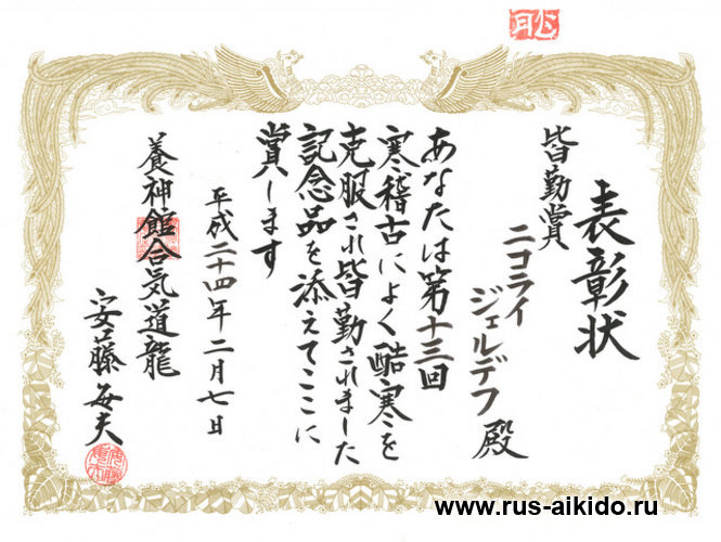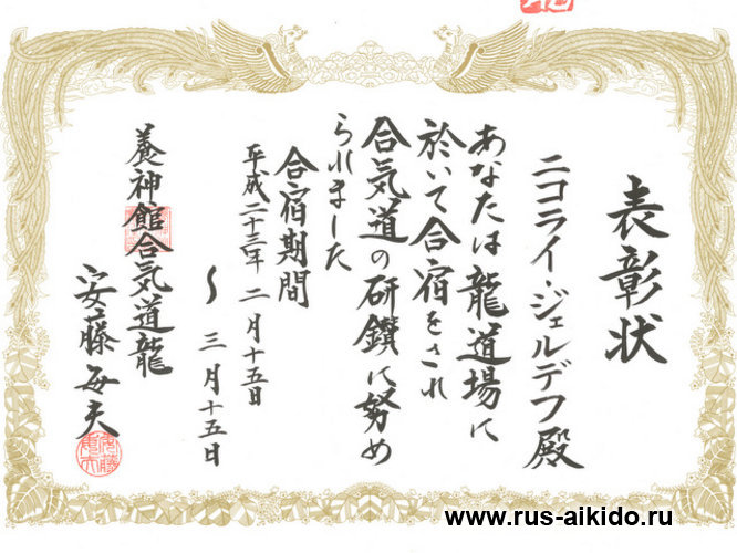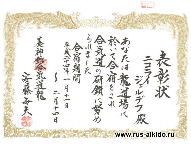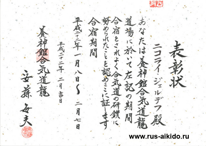 С этого момента, наша школа становиться частью Ёсинкан Айкидо Рю, а полноправным представителем и инструктором школы Ёсинкан Айкидо Рю на территории РФ, становится сенсей Жердев Н.Н.